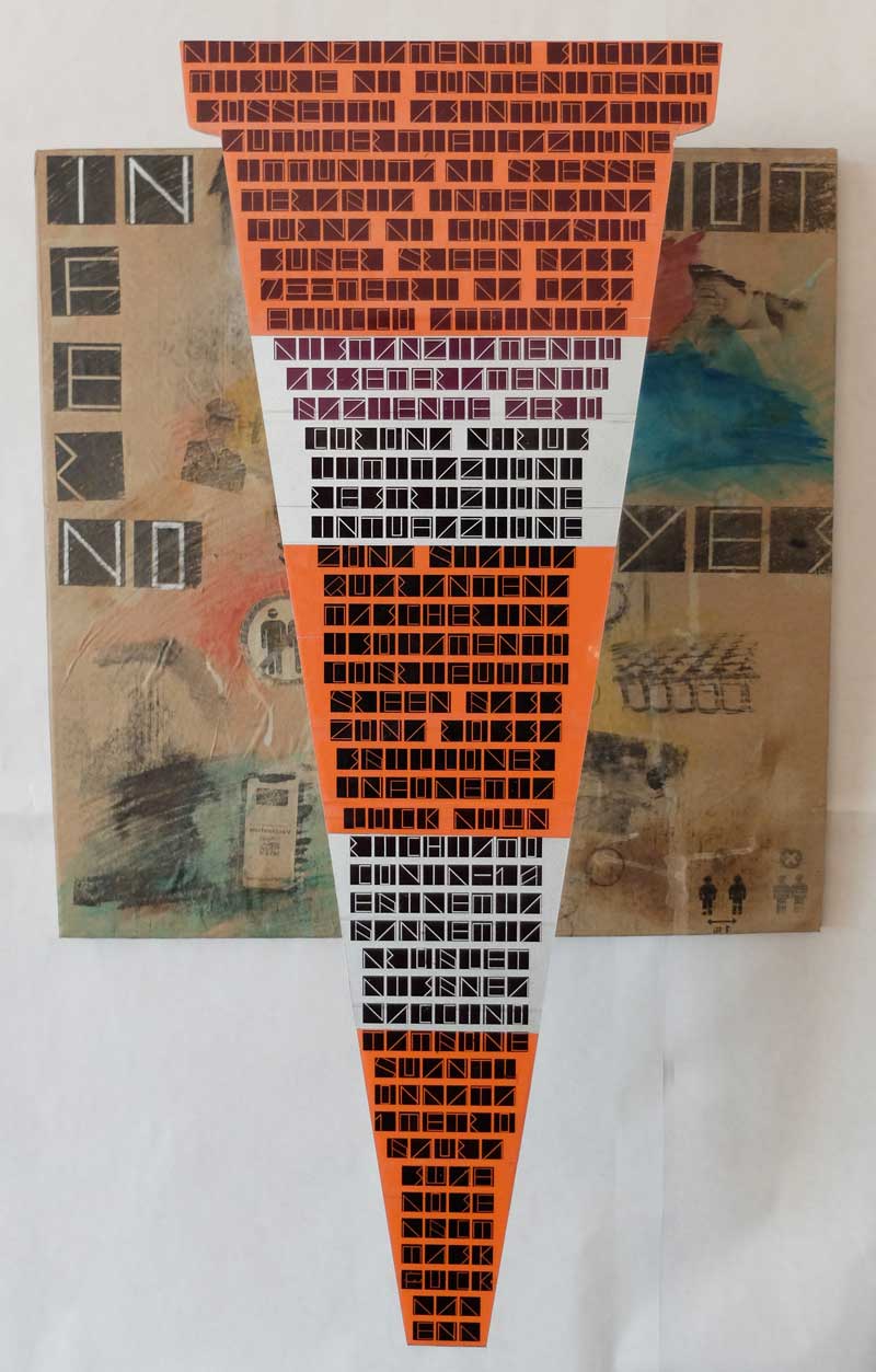 Interessante è l’affacciarsi di Dante da una parte e di Rauschenberg dall’altra sulla composizione centrale che, anche nei colori, mantiene toni bassi di rispetto e di piena sintonia, lasciando però al fruitore ampi spazi di lettura e di considerazione personale. Qualificanti in rapporto alla sua produzione e alla sua ricerca sono l’uso della candeggina su fustagno nero e di smalto stradale su asfalto nei due ritratti e l’applicazione in rilievo sulla tavola composita centrale di una figura di triangolo tronco capovolto, immagine mutuata dal cono stradale, che rimanda allo schema del succedersi dei gironi danteschi dell’Inferno dal primo cerchio del limbo al nono cerchio dei traditori.